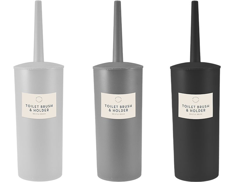 Each set measures H34cm x 10cm diameter in total, and consists of a bristled brush with plastic handle, and matte plastic holder.