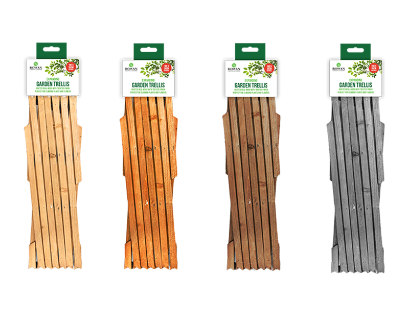 The expanding trellis measures approximately 180 x 30cm, constructed from riveted real wood with a treated finish. Each slat has four rivets.