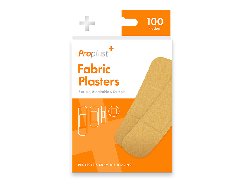 This pack of Fabric Plasters contains 100 assorted shaped plasters that are durable, flexible and breathable.
