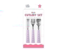 These three piece cutlery sets includes a knife, fork and a spoon with a fun lilac polka dot themed design on the handle, ideal for teaching to use and promoting independant use of cutlery.