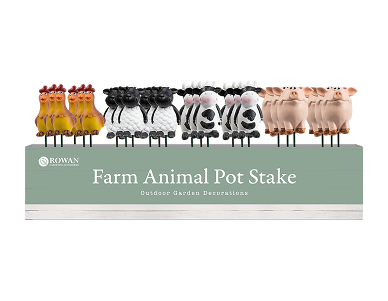 Each pot stake CDU features four assorted animals including a cow, sheep, chicken and pig. Each animal figure is attached to a plastic stake, perfect for putting into flowerbeds, plant pots, garden lawns, and more.