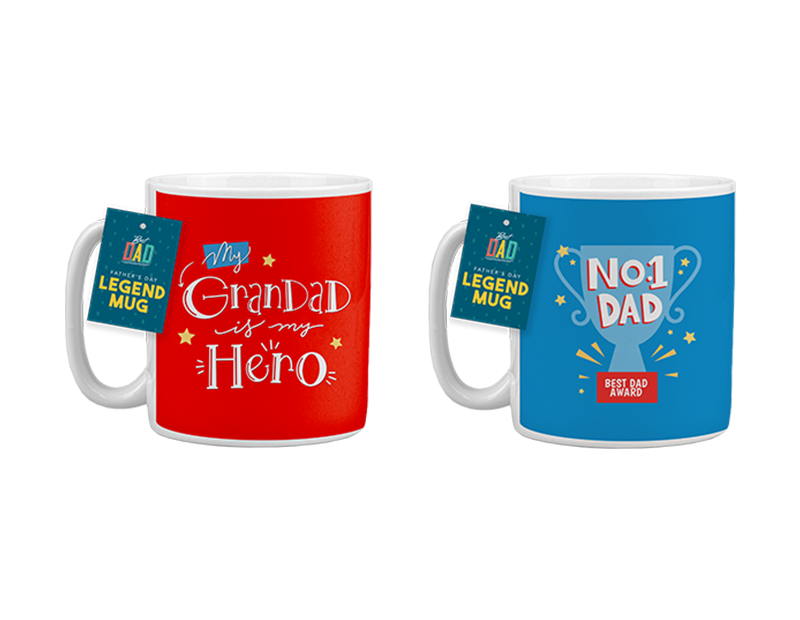 Each mug is constructed from ceramic and measures H9.5cm x 8cm diameter and holds up to 300ml, featuring a fun Fathers Day design printed on both sides. Each carton contains two assorted designs, one for dad and one for grandad.