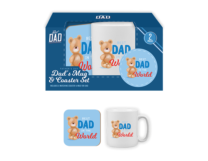 Each set comes with a 300ml ceramic mug that features a blue painted inner and a printed design on one side with an cute teddy bear and slogan reading 'Greatest Dad in the World'. Set comes with a matching cork coaster with the same design.