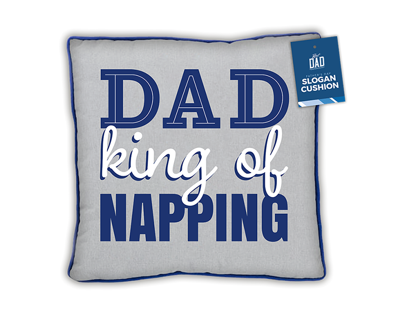 Each cushion measures L38 x W38 x D10cm in a solid grey colour and features a Father's Day Slogan of "Dad King of Napping". Cover is made from 100% Polyester with a polypropylene filling. (Filling included)