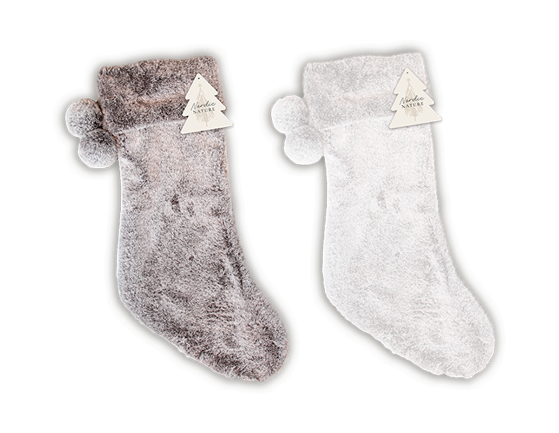 Made from 100% Polyester with a faux fur construction, each stocking measures L55 x W20cm, and features a hanging loop and pompoms attached.