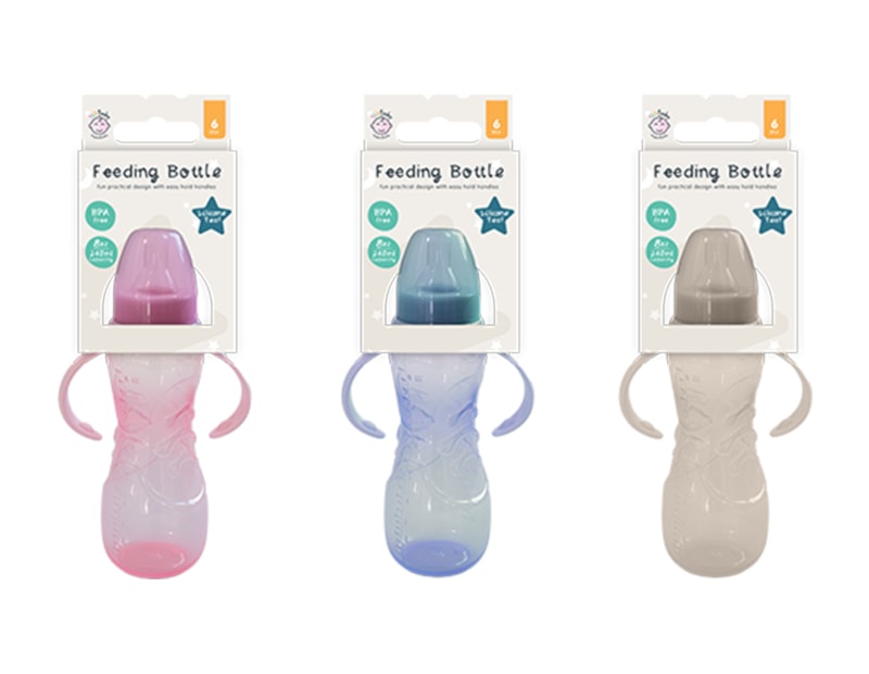 Practical feeding bottle, perfect for babies aged 6 months +. The easy-hold handles make it easy to grip and help promote self-feeding.