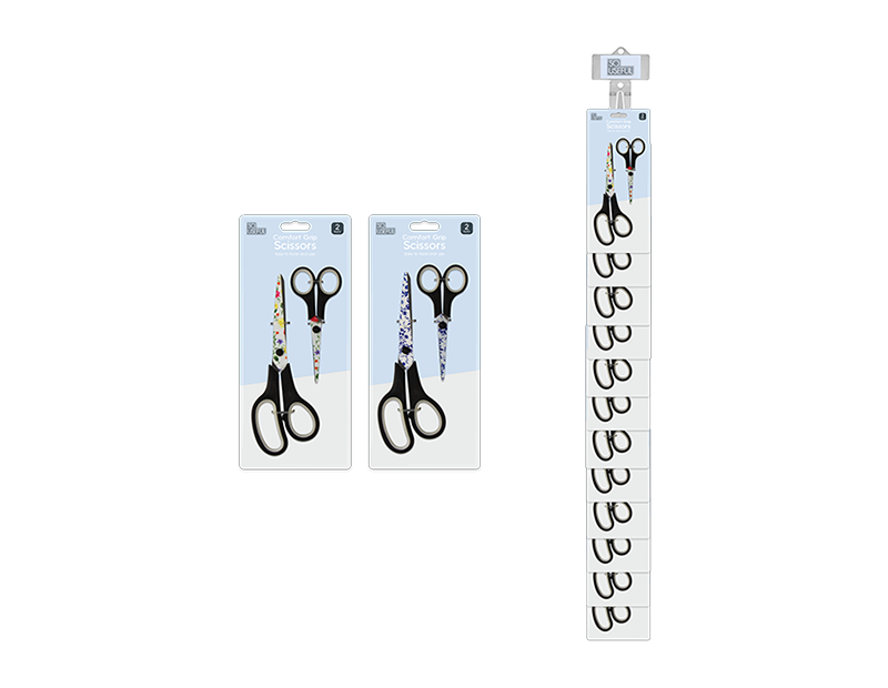 Each pack contains two pairs of scissors in two sizes, with stainless steel blades.
