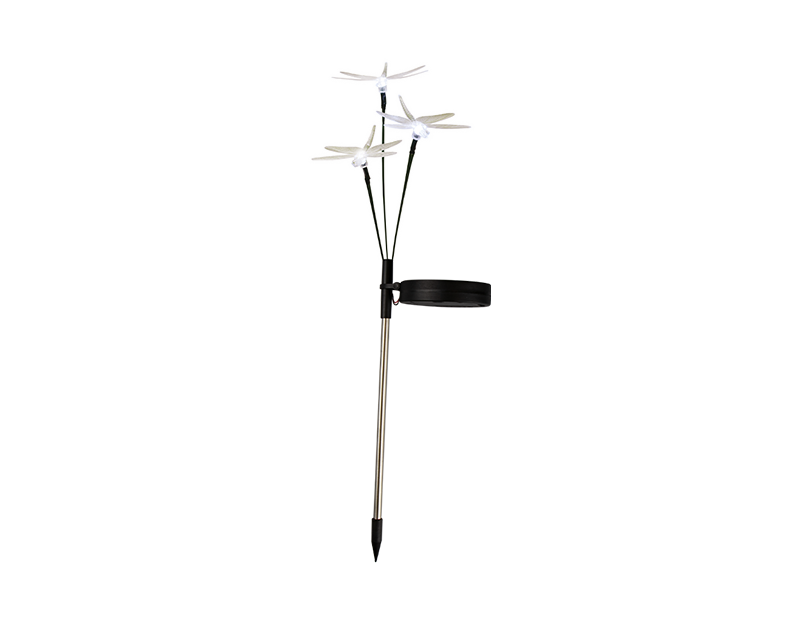 The dragonfly set is approximately 50cm tall and simply pushes into soil by using the attached stake.
