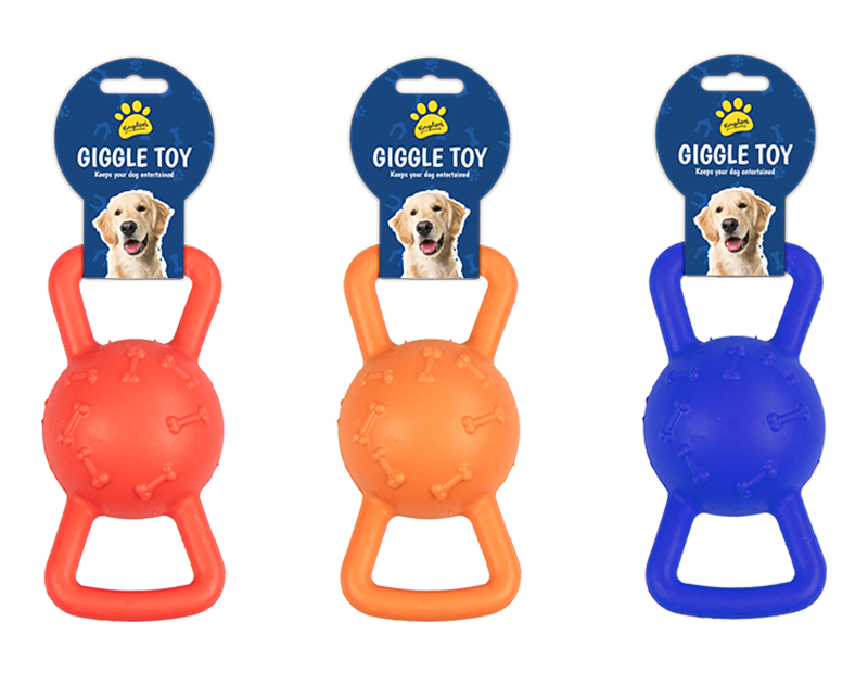 Rather than the usual squeak, these dog toys make a giggling sound when thrown or moved around. With grippy handles on both sides, these dog toys are designed to withstand all kinds of biting, tugging and throwing. They feel 'grippy' but are also squashable for maximum dog entertainment.