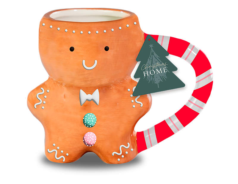 Each mug is constructed from durable ceramic and is shaped like a gingerbread man, with painted facial features, a bow tie and buttons. Each mug measures H12.5 x W15cm in total.