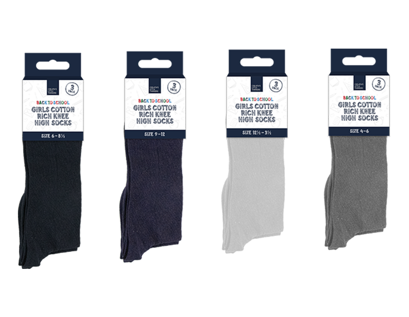 Girls Cotton Rich Knee High Socks 3pk 4 asstd sizes