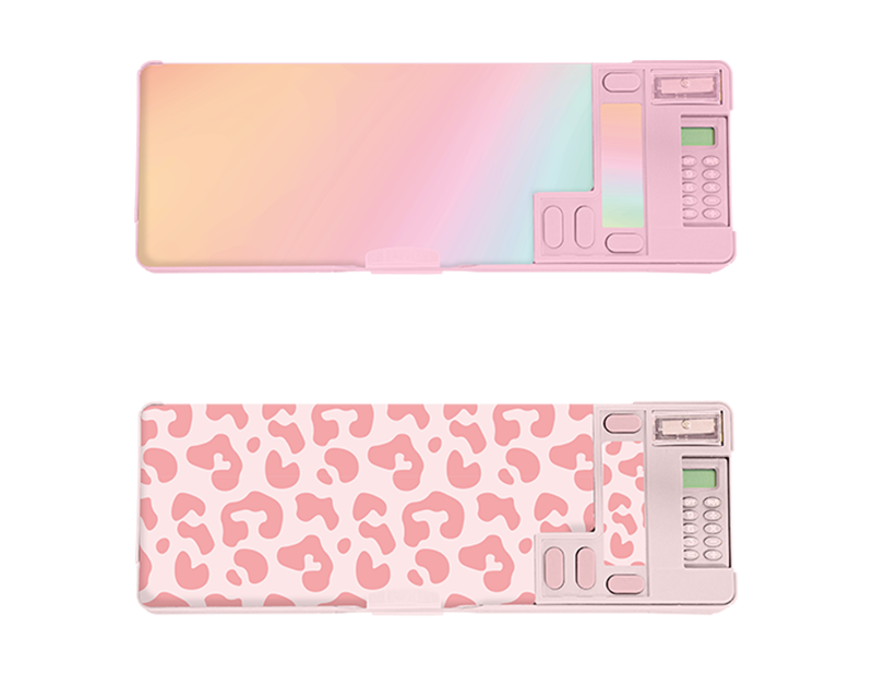 Each pink pencil case has two large main magnetic compartments on the front and back, and four buttons that eject secret compartments from within, including a calculator and sharpener with a flip top lid to empty when full. There is also a name and class sticker on the bottom and a class timetable inside.
