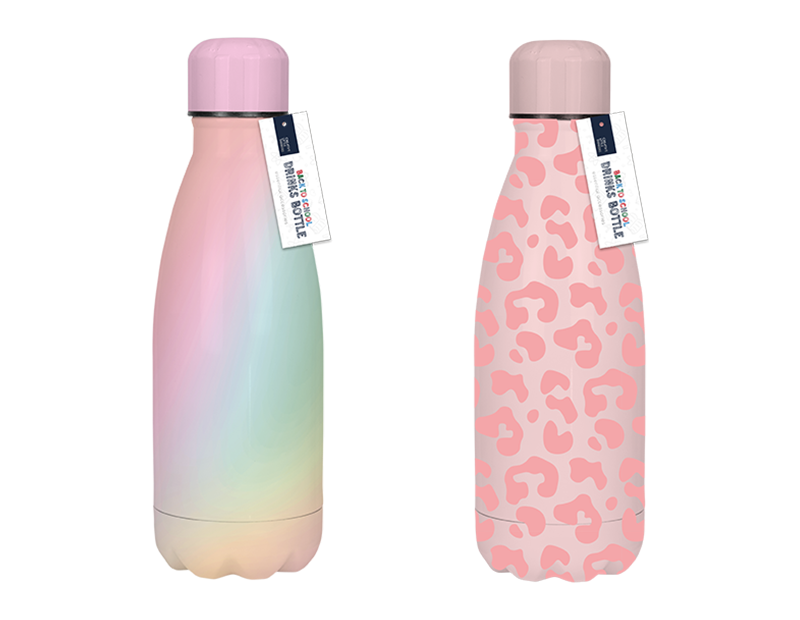 Each bottle has a 350ml capacity, perfectly sized for school bags and lunch packs, and features a durable metal construction, designed to help keep cold drinks cool for up to 24 hours. Each carton contains two assorted designs including ombre and leopard print with pink lids.
