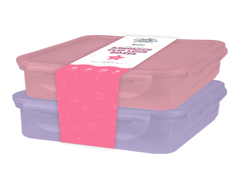 This two pack of sandwich boxes is perfect for kids lunch boxes, or storing food at home. Perfectly shaped and sized for sandwiches and other lunch items. Each pack comes with two individual sandwich boxes in pink and purple.