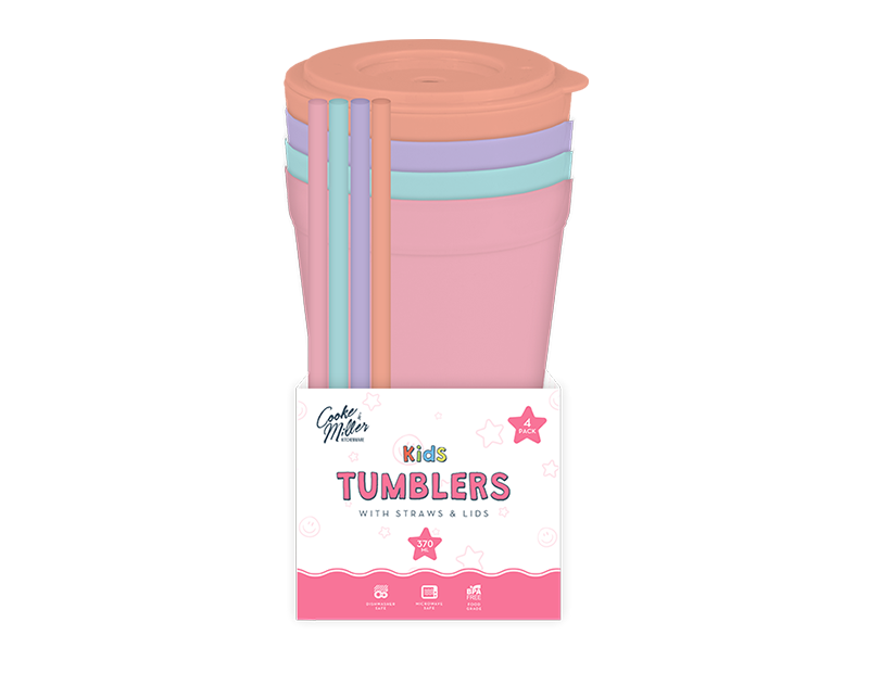 Each pack comes with four tumblers, in pink, lilac, coral and mint pastel colours. Each cup is made from BPA free plastic, can hold up to 370ml and comes with a lid a matching lid and straw.