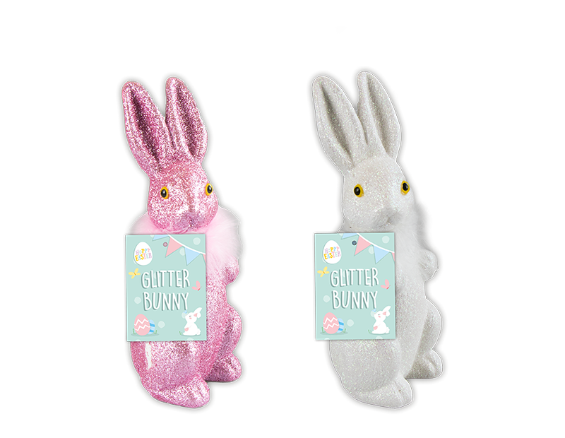 These PP plastic bunnies are coated in glitter with a feather detail around the neck and coloured beads for the eyes.