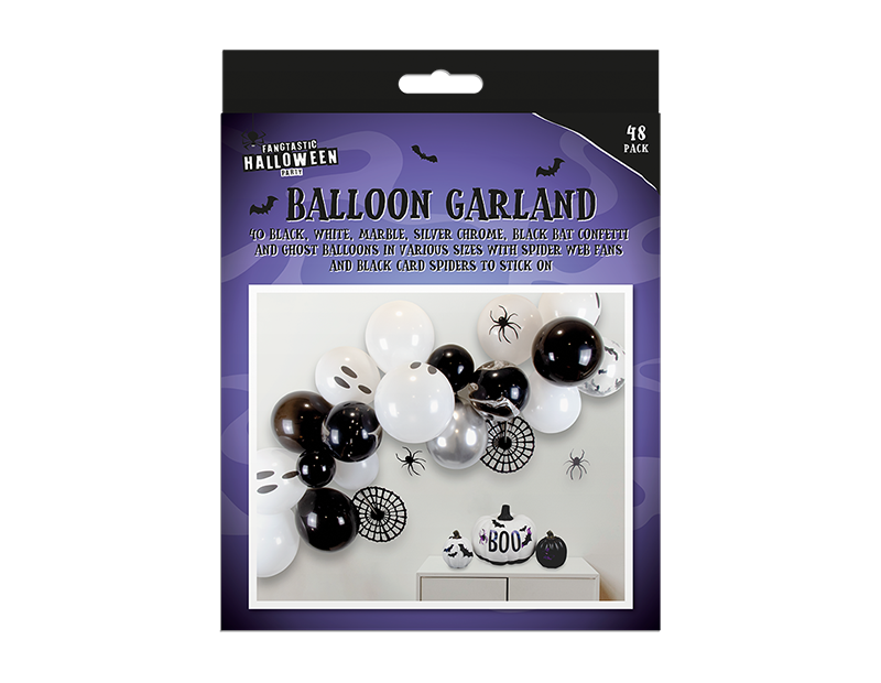 The perfect balloon garland to get a Halloween party underway. Each pack contains 40 black, white, marble silver chrome, Black Bat confetti and Ghost balloon in various sizes with spider web fans and black card spiders attached.