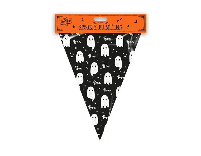 This spooky Halloween Bunting is approximately 3 metres in length and features ten flags that each have a printed ghost design.