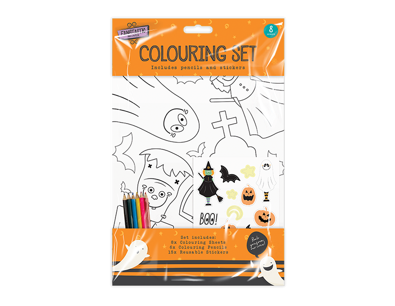 This Halloween colouring set includes eight sheets that can be personalised and coloured using the six included colouring pencils.