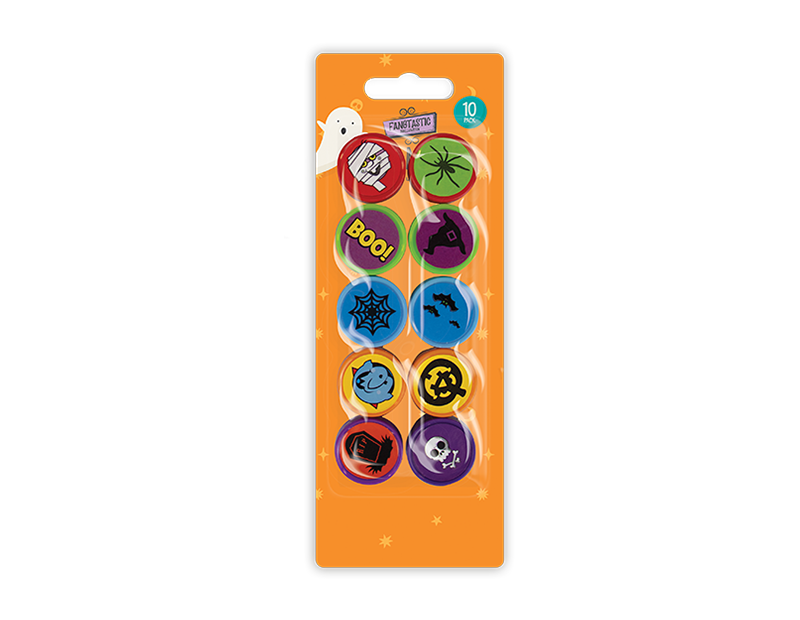 Each pack contains ten different spooky character stamps in designs including pumpkin, spider and skull. Stamps are split into five colours: purple, blue, orange, green and red.