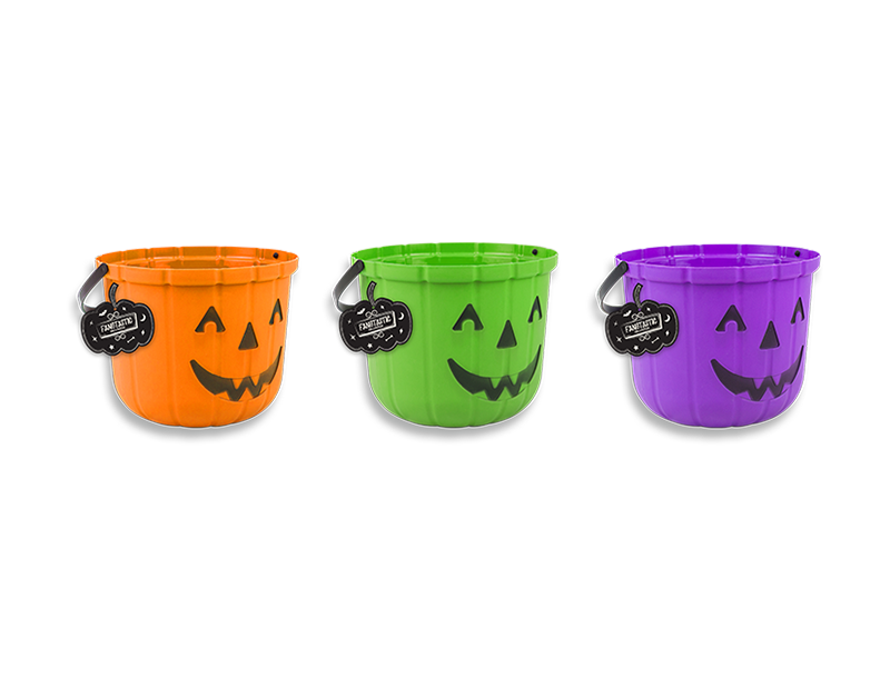 These Halloween Pumpkin Buckets are constructed of durable plastic and feature a Jack O' Lantern design. Ideal for trick or treating, or for serving sweet treats in at parties.