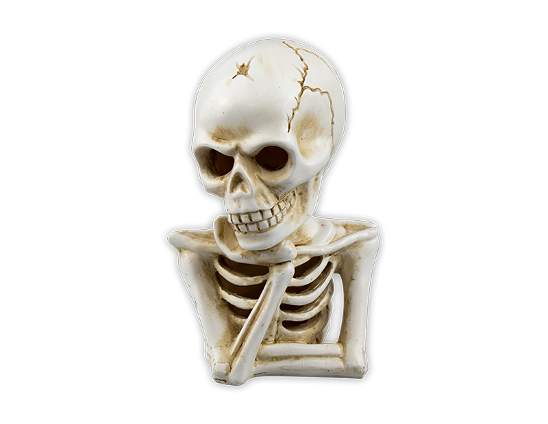 This sitting skeleton decoration is great for Halloween decor, parties and for frightening trick or treaters.