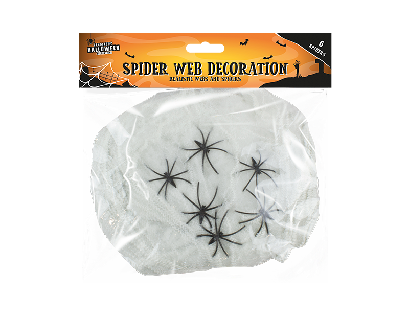 The spider web is constructed from polyester and is complete with six plastic spiders that each measure 4cm x 4cm.