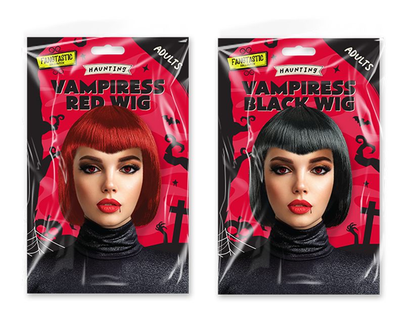The perfect finishing touch to any vampiress costume. These wigs come in one size and feature a straight, chin length style with a full fringe. Each wig is light weight and breathable.