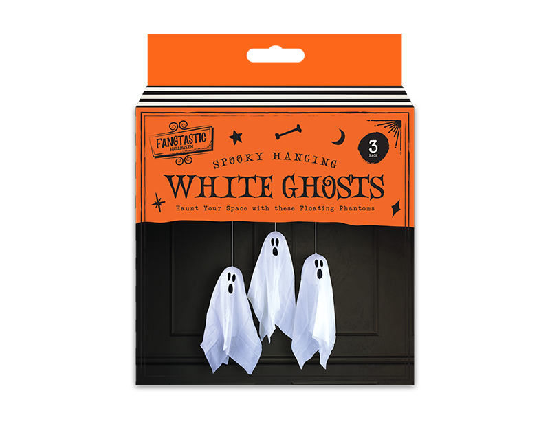 Three white hanging ghost decorations to help get into the spooky spirit.