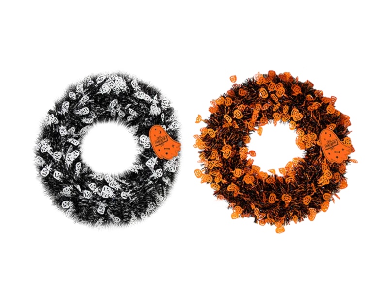 Decorate the front door this halloween with this spooky wreath. Each wreath is covered in black and white tinsel with white skulls.