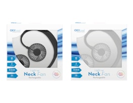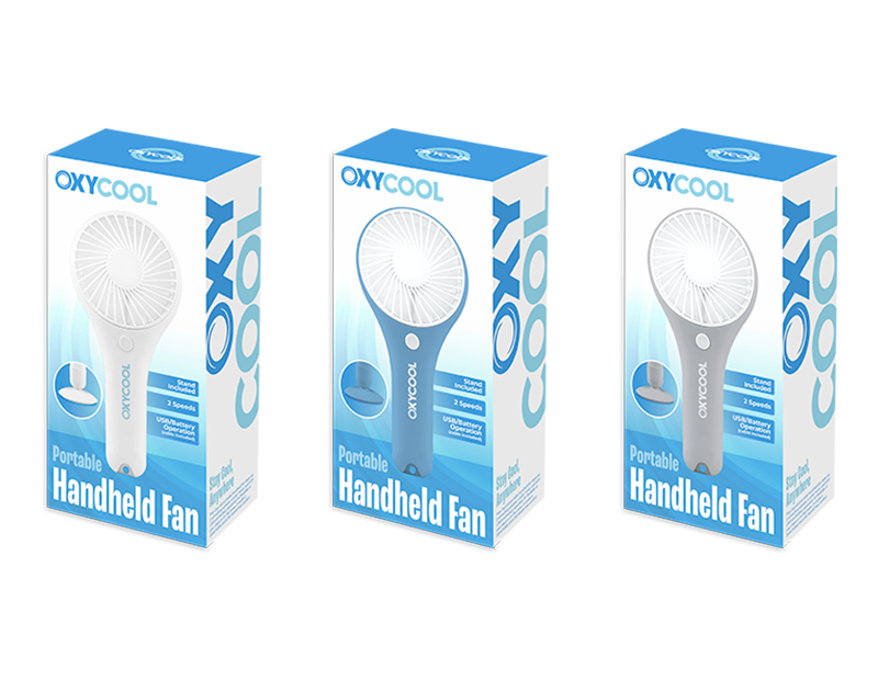 Each handheld fan measures L19.5 x W9 x D3.5cm. Simply press the button on the front to use. Each fan features a modern design, 2 speeds - cycle through them using the button on the front, and a handy stand.