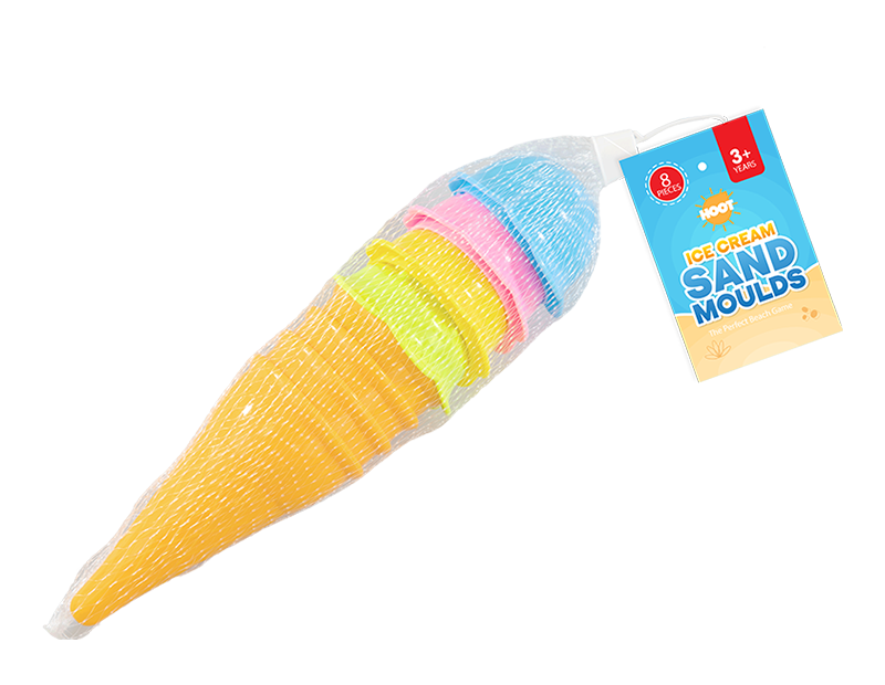 Each set comes with 4 x cone shaped sand moulds and 4 x ice cream top shaped moulds in assorted colours.