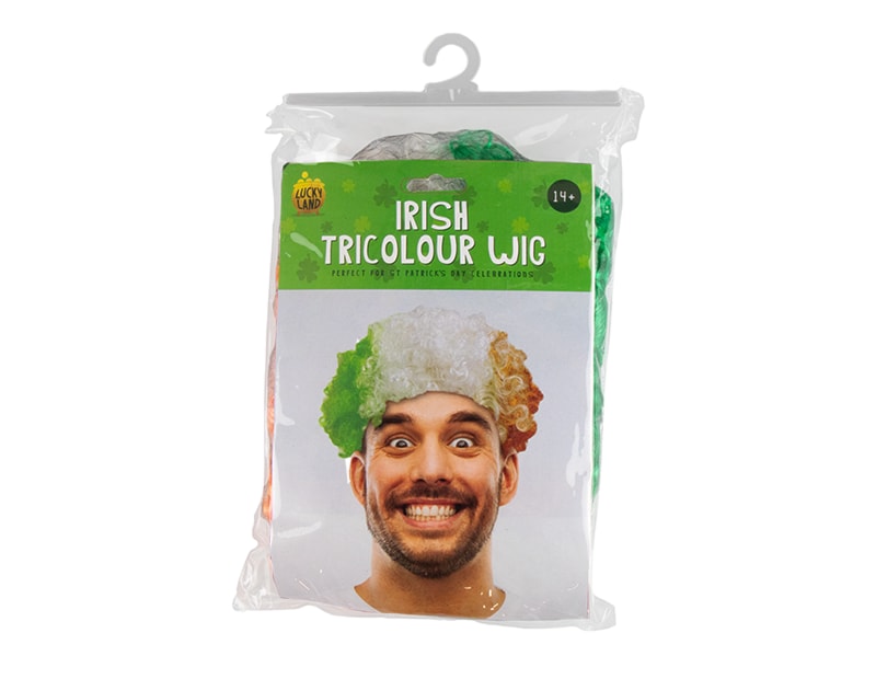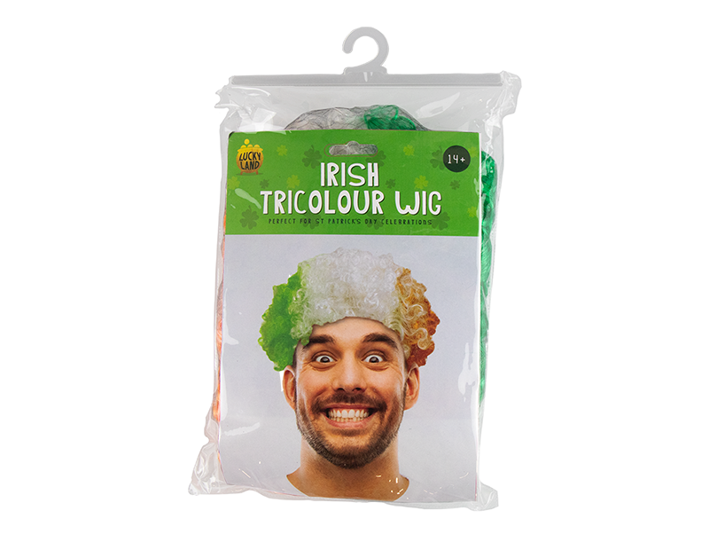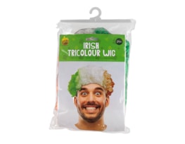 Afro wig (and hairnet) in traditional Irish colours, suitable for adults only. Constructed from 100% polyester.