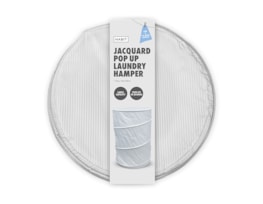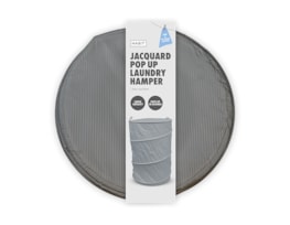 Each hamper measures H68cm x 45.5cm DIA approx with a large capacity, is made from easy care jacquard fabric and pops up in seconds. Featuring two handles, and two wooden toggles with loop to fold the hamper flat when not in use, and a metal spiral core to hold it's shape.