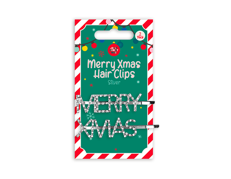 Constructed from silver metal with glass rhinestones, each pack contains 2 hair slides reading 'MERRY' and 'XMAS', making it the perfect finishing touch to any festive outfit.