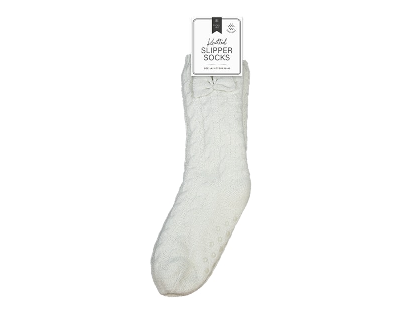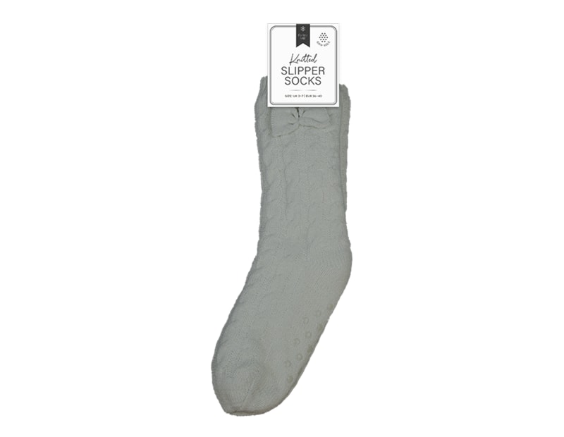 Each pair of slipper socks are knitted with a lurex thread, have a bow trim on the back of the cuff and feature gripper dots on the soles to prevent slipping.