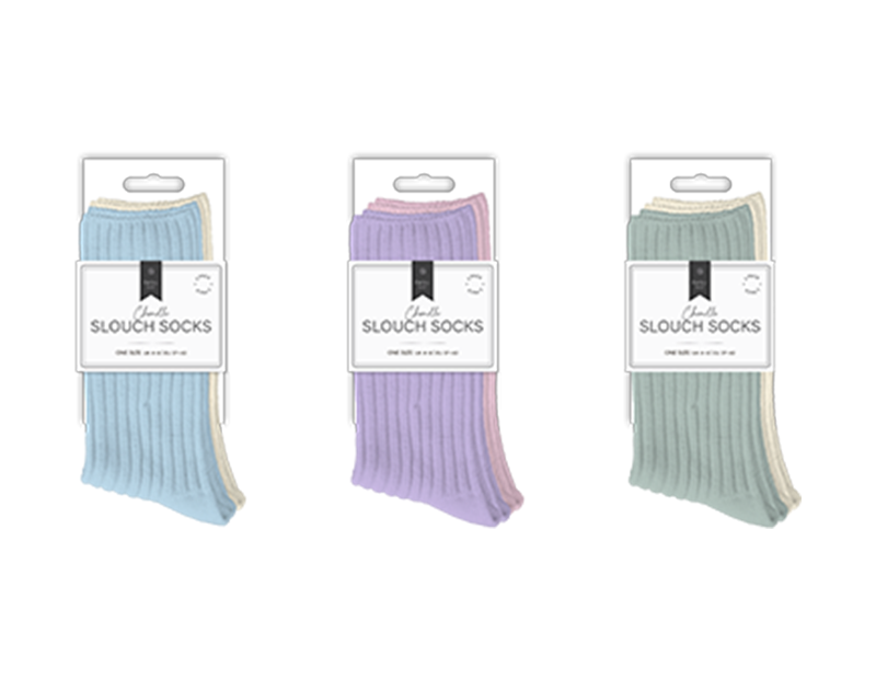 These super soft chenille slouch socks are great for keeping warm and relaxing in comfort and style. Each pack contains two pairs of socks, one pair in ivory and another in a solid pastel colour.