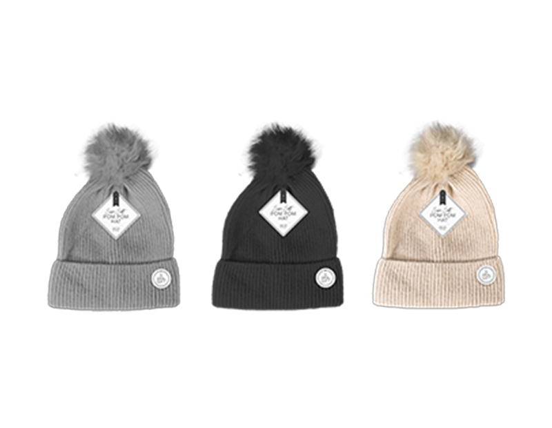 Each hat features a soft ribbed design with a large fluffy pom pom on top.