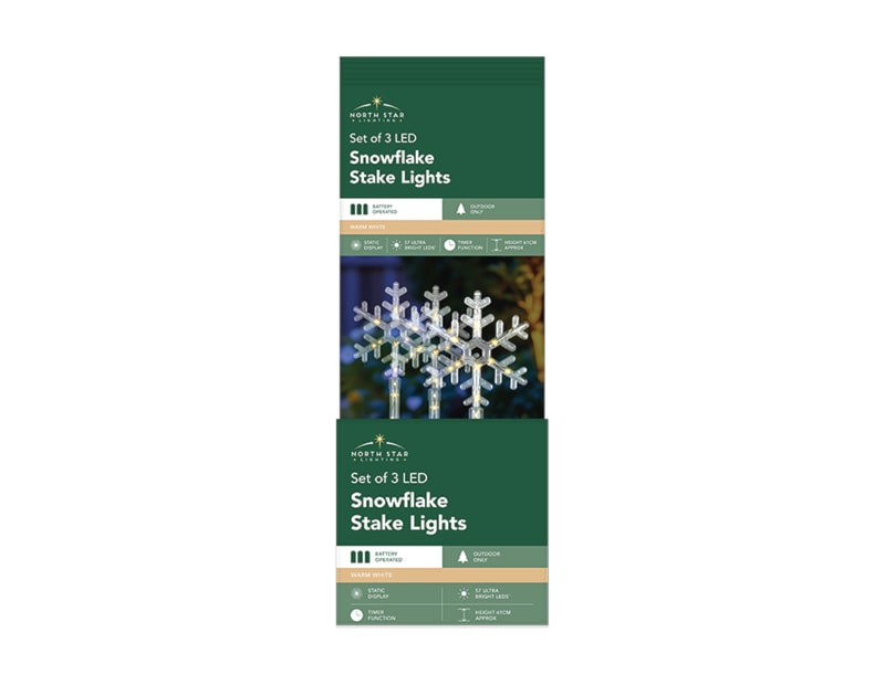 Enhance seasonal outdoor displays with this 3 Pack of LED Warm White Snowflake Stake Lights, designed to deliver a strong visual impact within Christmas decoration ranges. Featuring a classic snowflake-shaped design, these lights provide a clean and festive aesthetic, ideal for creating cohesive and inviting exterior displays.