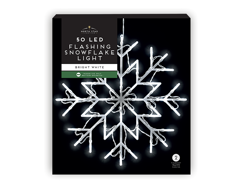 Flashing snowflake Light, suitable for indoor use only. Ideal for hanging from a tree or mounting to a wall. The snowflake has a sturdy frame which is powered by batteries 3 X AA batteries (not included). The total cable length is 50cm with the total diameter measuring 33cm.