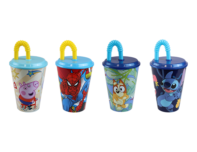 Each tumbler measures H16.5cm x 9cm diameter with a 430ml capacity and features a pop on lid with flexible straw that can be tucked away when not in use, and a fun licensed character design on the outer.