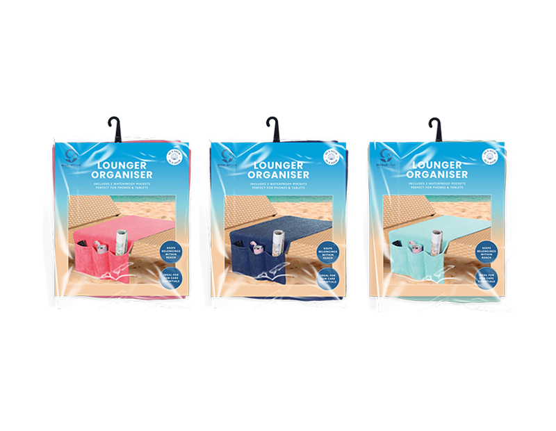 Each organiser measures W95 x L40cm approx and will fit on most standard size sun loungers. Including two large waterproof lined pockets, ideal for phones and tablets, and three medium pockets on the oposite side, perfect for sun care essentials.