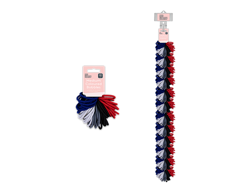Each pack comes with 8 bobbles each in colours red, white, blue, grey and black. Ideal for a wide range of hair styling needs.