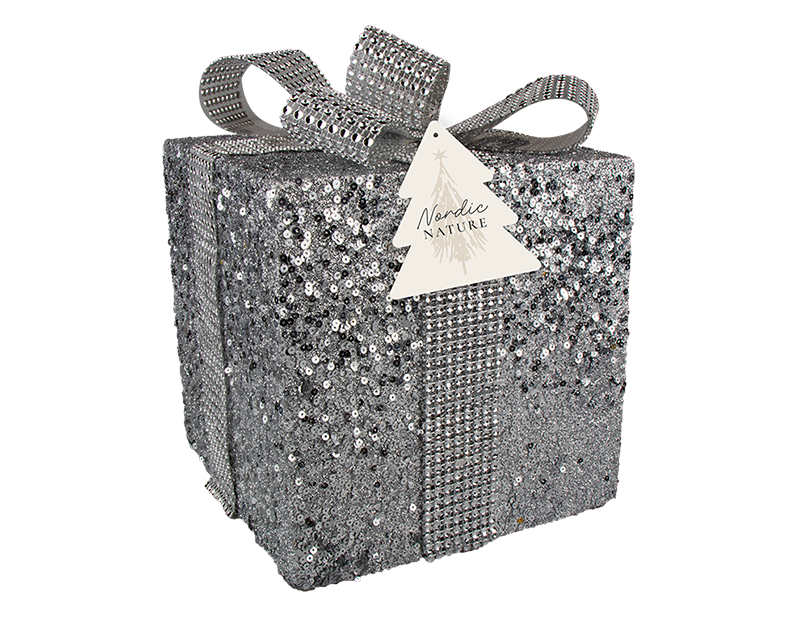 Medium glitter gift box decoration, perfect for adding to a Christmas aesthetic. The Giftbox decoration is constructed from polystyrene with a glitter coating and gem encrusted ribbon & bow.