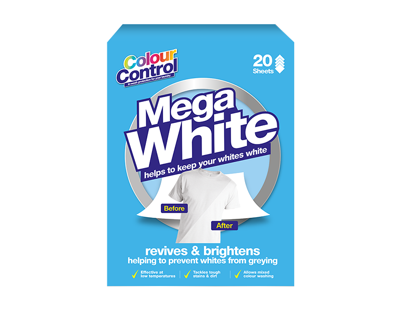 This pack of Mega White Laundry Sheets contains twenty individual sheets that revive and brighten white laundry and help prevent new whites from greying.