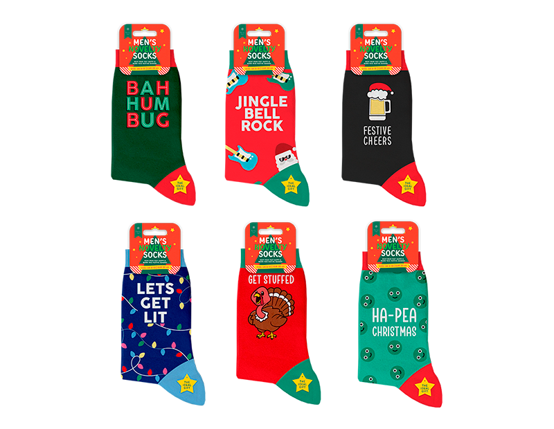 These novelty mens christmas socks are a staple for the festive period. Each pair of socks comes in black with a funny christmas slogan printed on either side.