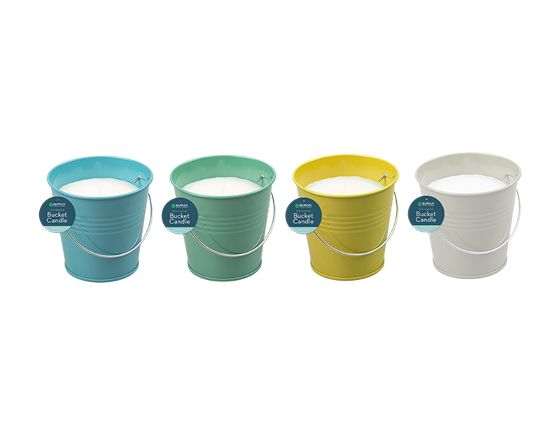 Each metal bucket features a carry handle, with natural coloured wax containing 3% citronella oil. Warning label printed on base. Each carton contains an assortment of four colours.