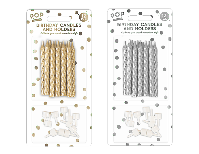 Each pack contains 12 individual candles in silver or gold colours, with plastic white candle holders.