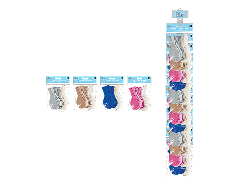 These balloons are made from natural rubber latex and contain 12 balloons with an gradient of colours. When inflated and presented next to each other the balloons present an ombre effect.