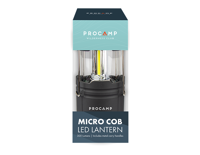 Camping micro COB lantern, 3 watts, 300 lumens. Each lantern features a bright white LED light and includes metal handles for carrying or hanging up. It's smaller size means it is easier to pack, carry and store. Perfect for back packing, camping, festivals and more.